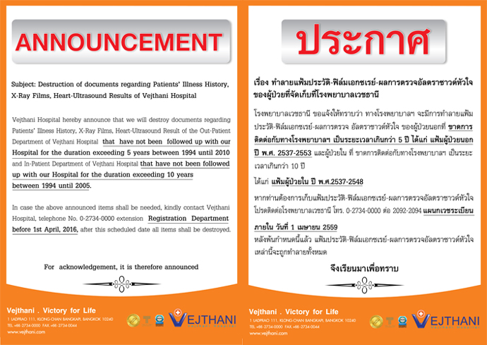 Annoucement Destruction of documents regarding Patients’ Illness History, X-Ray Films, Heart-Ultrasound Results of Vejthani Hospital